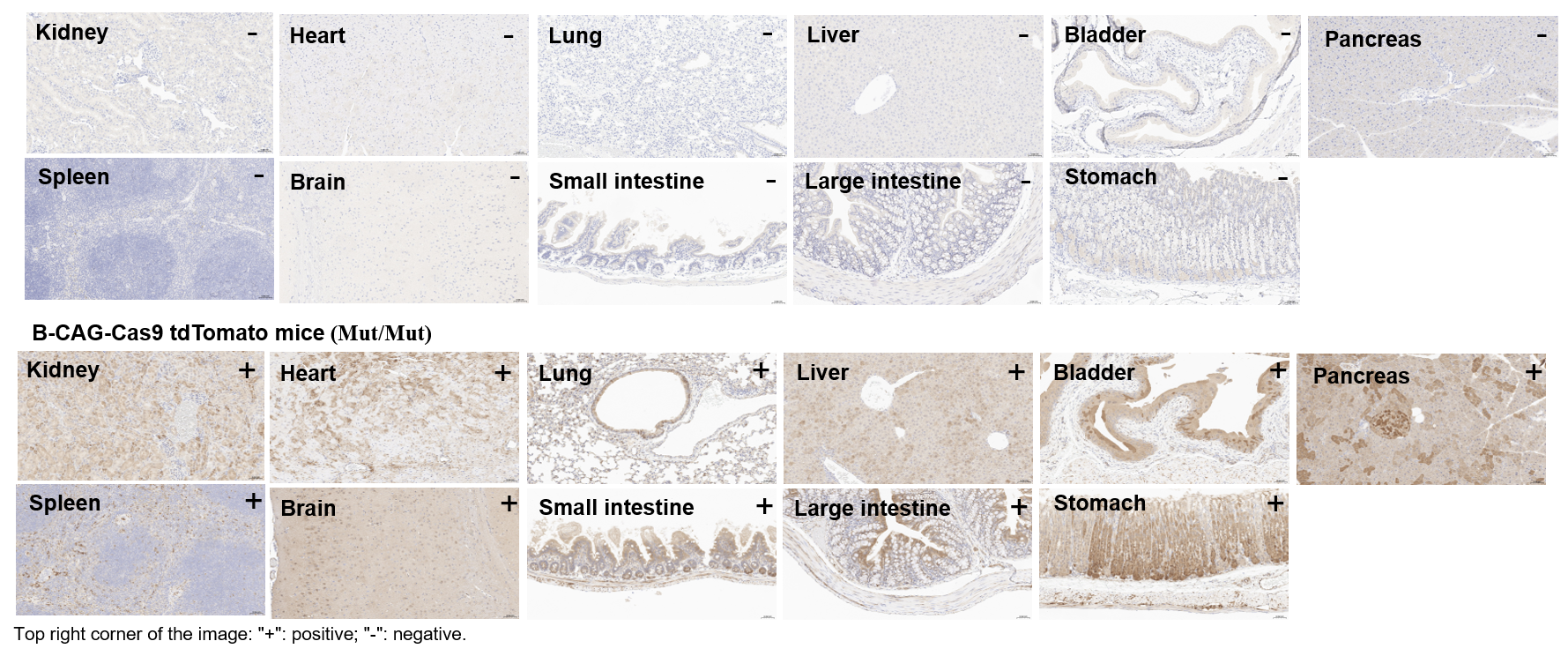 The protein expression analysis of tdTomato in B-CAG-Cas9 tdTomato flox mice and B-CAG-Cas9 tdTomato mice by IHC. Brain, heart, spleen, liver, lung, kidney, pancreas, bladder, stomach, small intestine and large intestine were collected from B-CAG-Cas9 tdTomato flox mice (fl/fl) and homozygous B-CAG-Cas9 tdTomato mice (Mut/Mut) and analyzed by IHC with mCherry/TdTomato Rabbit Polyclonal Antibody (HUABIO, HA500049). The results indicate that only the B-Rosa26-Cas9 tdTomato mice can express tdTomato protein.