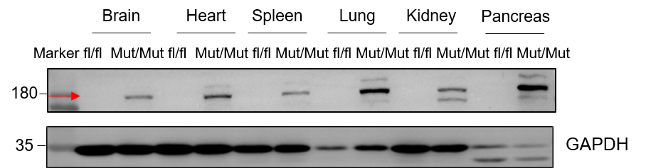 The protein expression analysis of Cas9 in homozygous B-CAG-Cas9 tdTomato flox mice and B-CAG-Cas9 tdTomato mice by western blot. Brain, heart, spleen, lung, kidney and pancreas were collected from B-CAG-Cas9 tdTomato flox mice (fl/fl) and homozygous B-CAG-Cas9 tdTomato mice (Mut/Mut) and analyzed by western blot with anti-Flag antibody (Sigma-Aldrich,F1804). Cas9 was detectable in brain, heart, spleen, lung, kidney, pancreas of homozygous B-CAG-Cas9 tdTomato mice, but not in B-CAG-Cas9 tdTomato flox mice. fl/fl: B-CAG-Cas9 tdTomato flox mice; Mut/Mut: B-CAG-Cas9 tdTomato mice.